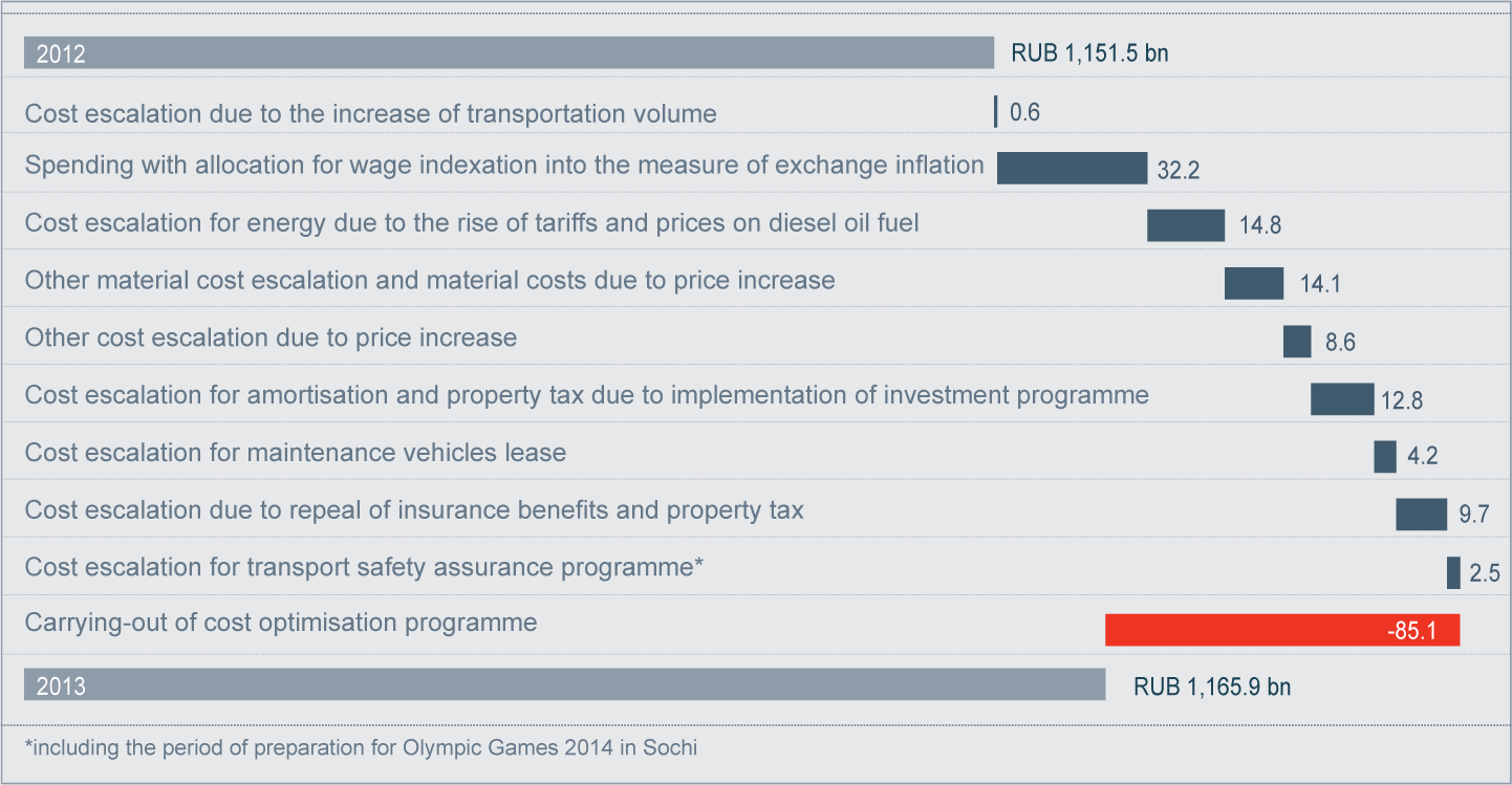 - A cost reduction of RUB 1.3 billion due to a decrease in transportation volumes – tonne-kilometre works gross weight in petrol-electric traction by 1.4% compared to the level of 2012;