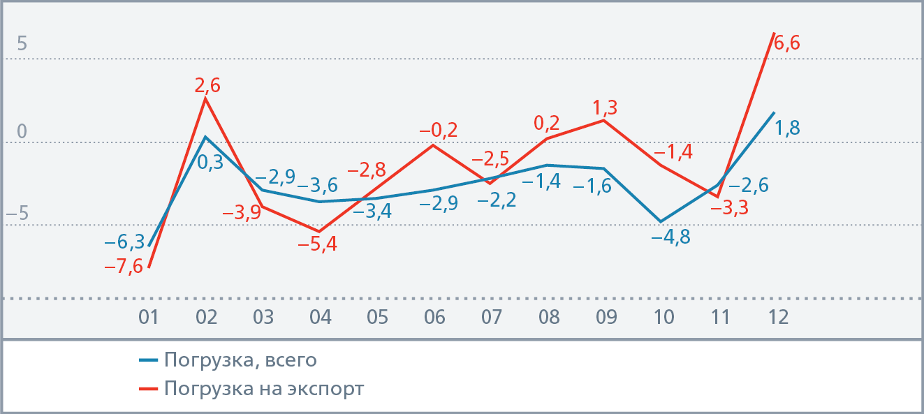 Снижение погрузки отмечалось на протяжении всего 2013 года, за исключением декабря, когда среднесуточная погрузка возросла на 1,8 %, в том числе в экспортном сообщении на 6,6 %. Отрицательная динамика среднесуточной погрузки обусловлена продолжившейся тенденцией стагнации роста промышленного производства.